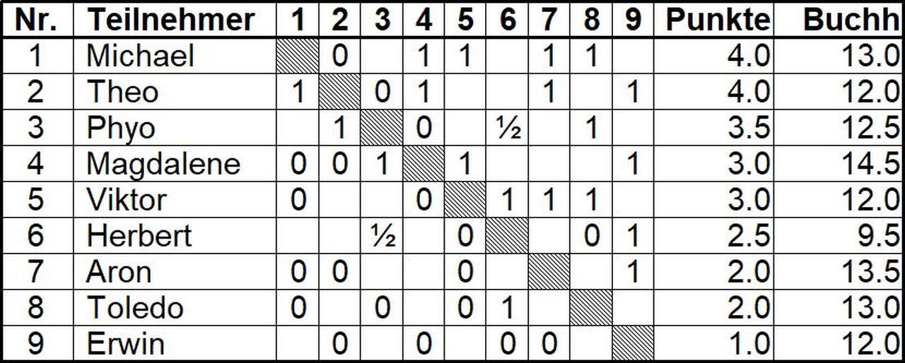 Wenn aber Toledo das einzügige Matt gegen Michael übersieht und Theo in der letzten Partie gegen Phyo verliert, dann ist Michael wieder einmal fein raus – in der Feinwertung.